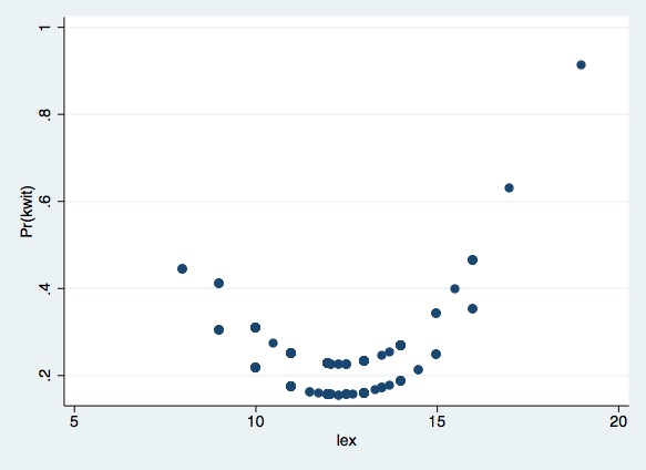 \[ Pr(kwit=1)=\frac{exp(x_{j} \beta)}{(1+exp(x_{j}\beta))} \]