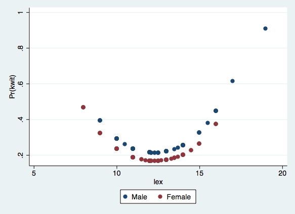 To draw a picture of the probability of quitting as a function of years of education, holding everything else constant (e.g., at their mean value), you need first to ask for mean of dexterity for the pooled sample, and then you can do it for males and females.