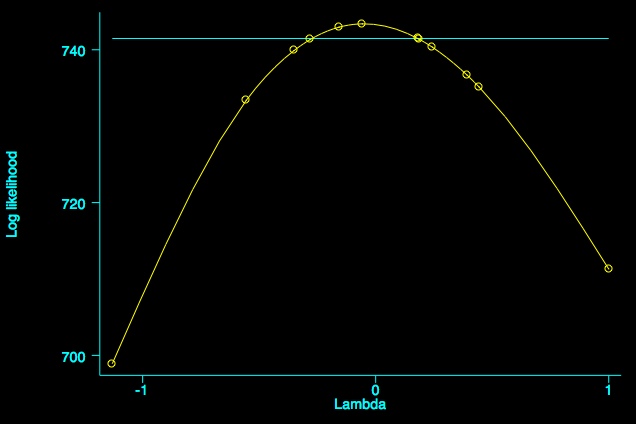 As you see, the MLE for λ is very close to zero (-0.050263). The picture is drawn using smoothing spline techniques to help you envisage the log-likelihood function and the MLE of λ. The horizontal line corresponds to the 95% confidence interval. Next we can apply the power transform to y and then fit the revised model: