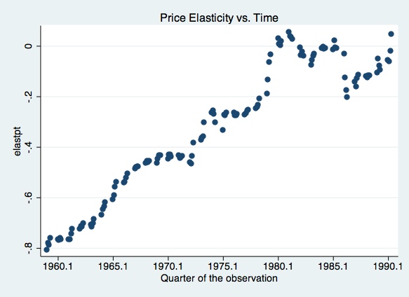 inter-temporal structural breaks), against price, and against income. scatter elastpt quarter, xlabel(1960.1 (5) 1990.1) t1title(Price Elasticity vs. Time)