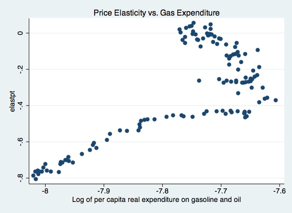 scatter elastpt gas, t1title(Price Elasticity vs. Gas Expenditure)