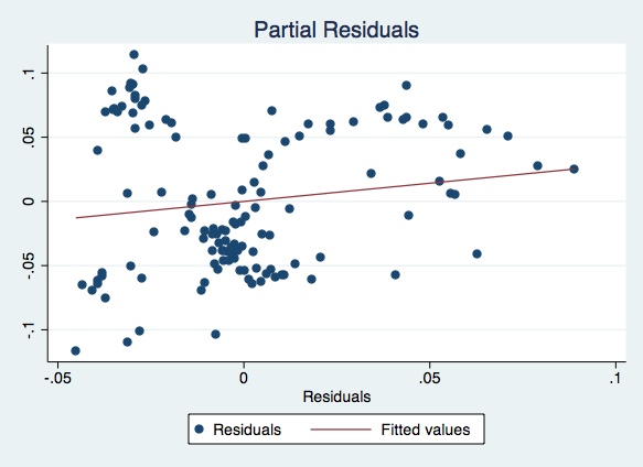 twoway (scatter gasres pric2res) (lfit gasres pric2res), title(Partial Residuals)